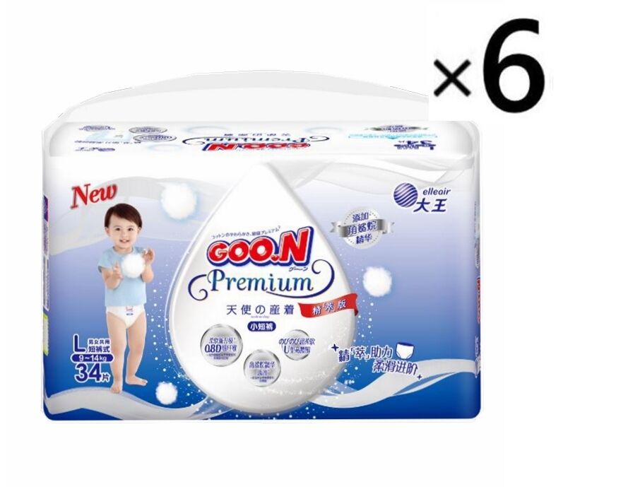 Goo.N Premium Nappy Pants Angel Size L 1Carton 204pcs (L34x6) 9-14KG 大王 天使拉拉裤