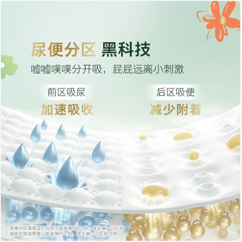 - 独特不同的尿便吸收层,中前区为快速吸尿区,背部设计易吸便便,从而加强了挡屎条的作用