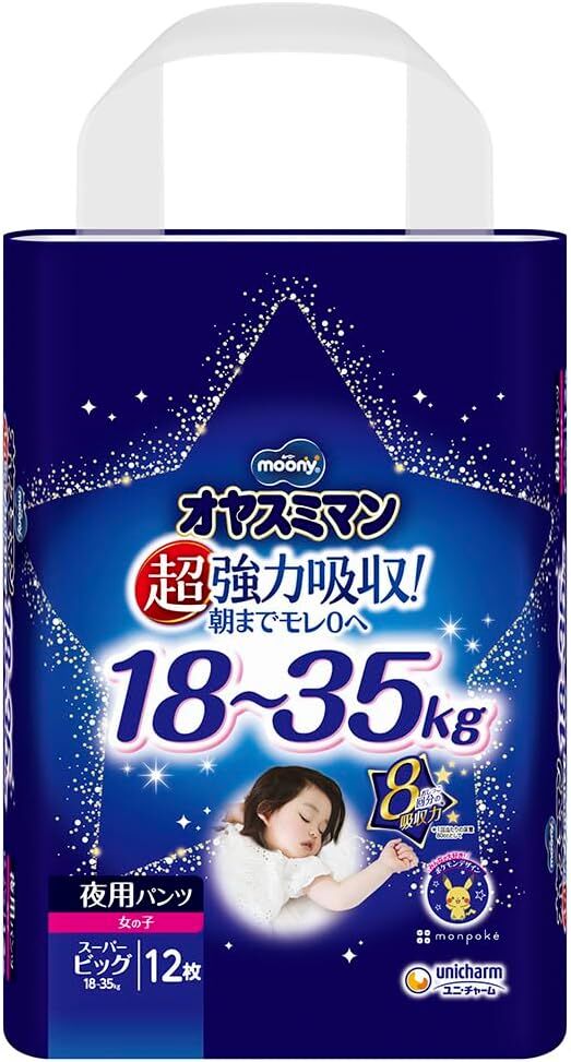 Moony Night Pants absorb the equivalent of 8 pees, ensuring zero leaks until next morning. The soft touch gathers prevent rubber marks . It features a Pokemon design